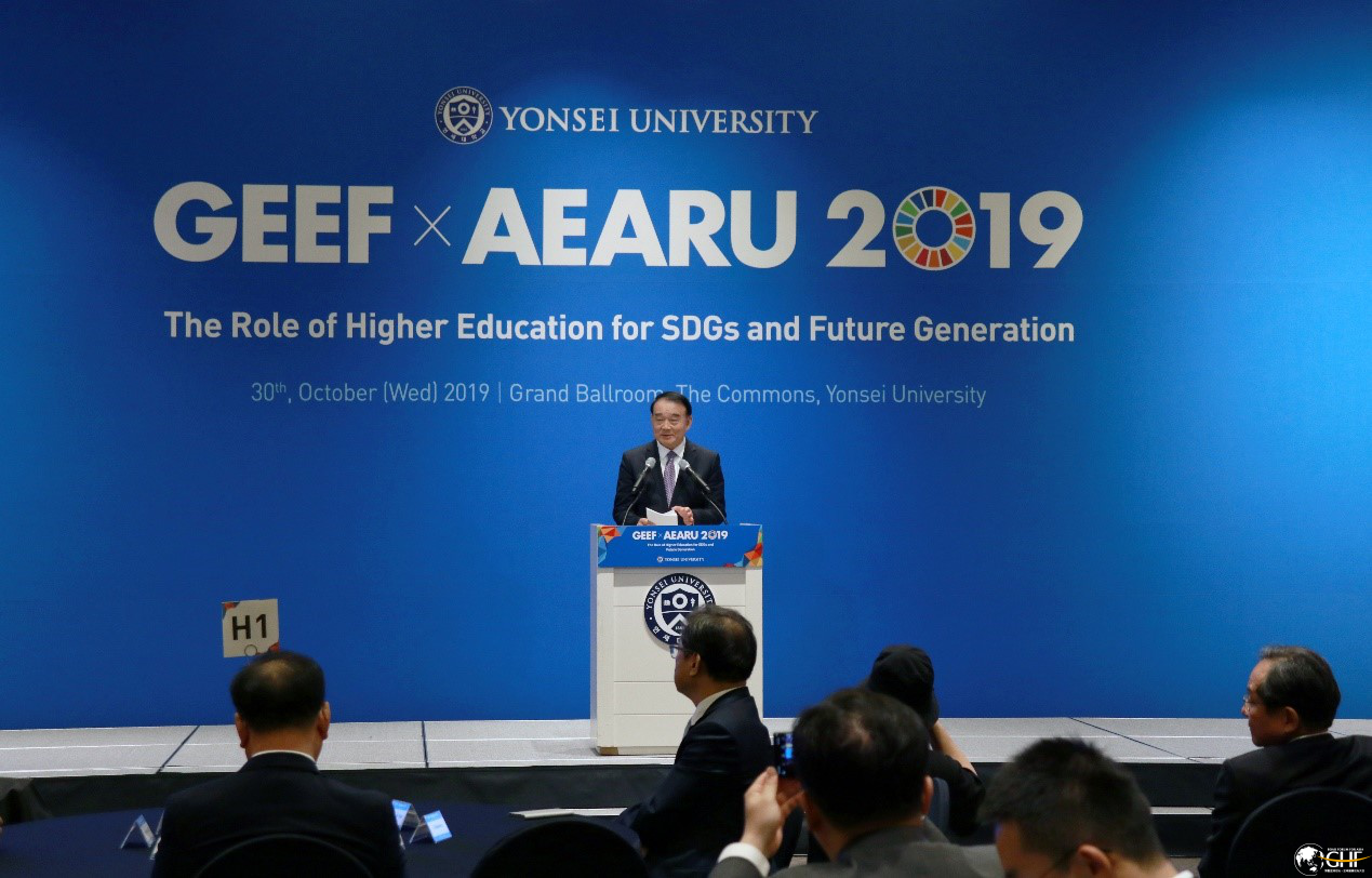 2019年10月30日,潘基文理事长和李保东秘书长应邀参加在韩国首尔延世大学举行的“全球参与和可持续发展赋权论坛”和“东亚研究型大学联盟”联合会议,并在开幕式上发表主旨演讲,阐述高等教育在实现可持续发展目标中的重要作用。
